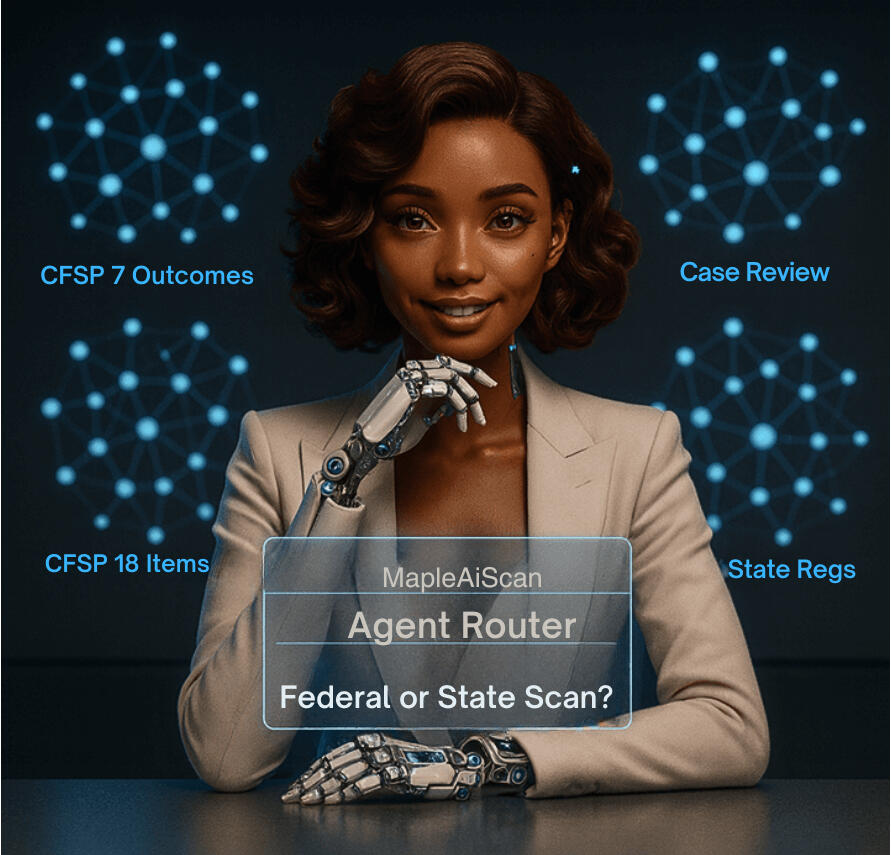 MapleAiScan will read files (pdf, docx, txt) for conformity issues across 7 outcomes and 1 or more of 18 associated CFSP items, or chosen State Regs. You decide State scan focus items. Caseworkers alerted.